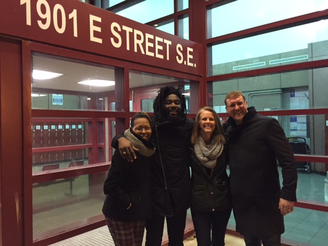 From left: Book Club & Reentry Manager Keela Hailes, Author Jason Reynolds, Co-founder & Book Club Facilitator Kelli Taylor, and Author Brendan Kiely outside the DC Jail