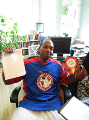 Demetrius shows off the list of vocabulary words he learned through Free Minds while in prison. The new BAM! initiative will enable more members to stay involved and learning.
