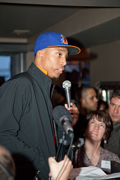 Left: Drew Williams shares his success story with the Marvin crowd. At the age of 17, Drew was incarcerated on robbery charges. Now 22, Drew has his GED and recently graduated from barber school. He has a full-time job cutting hair for a large and loyal clientele at a shop in NE DC. Drew plans to go to college and study business, and eventually open his own barbershop.